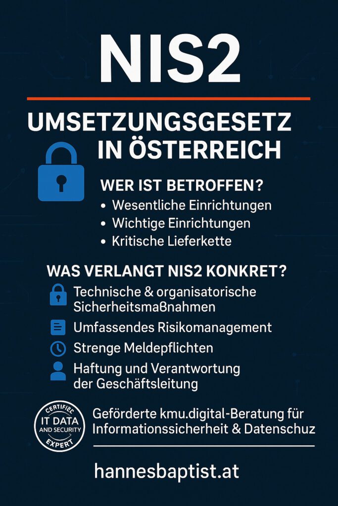 NIS2-Umsetzungsgesetz (NIS2-UG) in Österreich Was Unternehmen jetzt wissen und umsetzen müssen Mit dem Inkrafttreten des NIS2-Umsetzungsgesetzes (NIS2-UG) hat Österreich einen neuen, deutlich strengeren Rechtsrahmen für Cybersicherheit geschaffen. Die europäische NIS2-Richtlinie wurde damit in nationales Recht übertragen – und betrifft nun weit mehr Unternehmen als bisher. Viele Organisationen stehen erstmals in der Pflicht, strukturierte Sicherheitsmaßnahmen, Risikomanagementprozesse […]